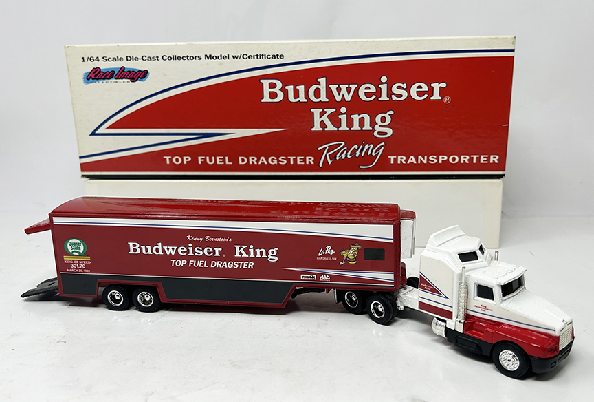 | Budweiser King T/F Dragster Racing Transporter | ERTL | 1:64 Scale Model | Budweiser King T/F Dragster Racing Transporter | 1 | NEW | $70 | |