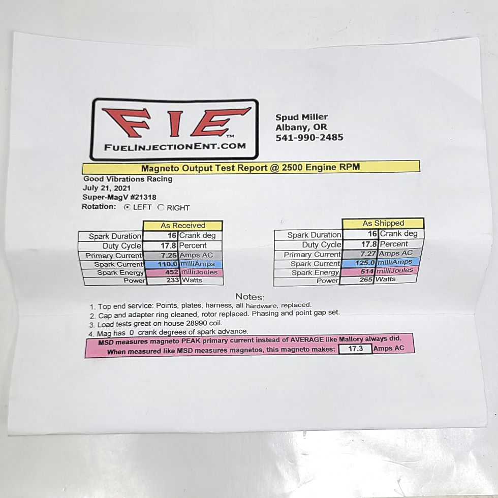| Magneto Generator V | Mallory/ FIE | Super Mag V. LH ROTATION (CCW) COMPLETE SERVICE BY FIE s/n 21318 7.27 amps | 1 ea | FRESH ! | $1275 |